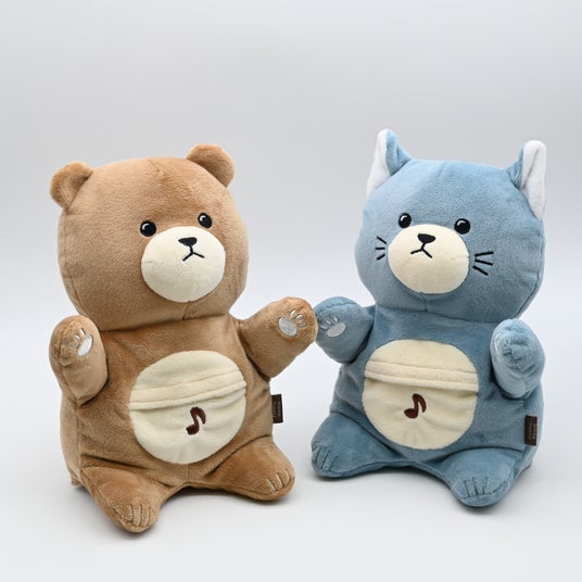 誕生日の歌に名前入りで歌う、バースデーパペット クマ(左)ネコ(右)
