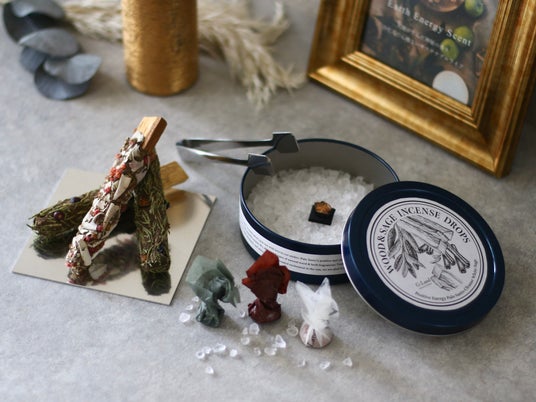 Positive Energy Palo Santo Chips & Incense Drops -Wood & Sage 税込3,960円(内容物:トンカビーンズ&チャコール:4粒、ホワイトセージインセンスドロップ:4粒、パロサント&シナモンインセンスドロップ:4粒、クリスタルソルト、トング、缶プレート))