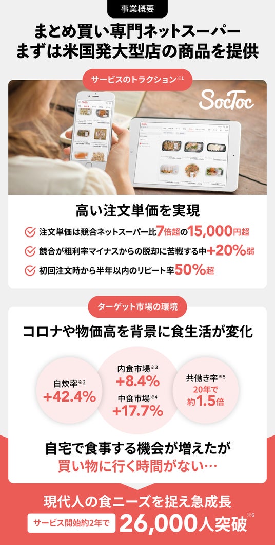 当社は、大容量まとめ買いニーズに対応したネットスーパー「SocToc」を展開しています。現在は米国発会員制大型スーパーであるコストコの商品に特化しており、独自のECサイトと物流網を構築することで、家にいながら手軽にまとめ買いできる仕組みを提供しています。
