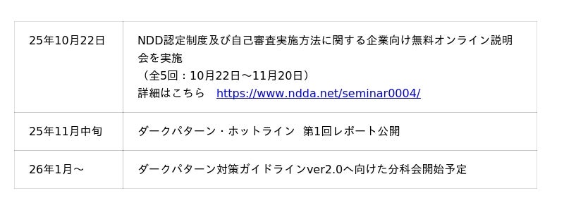 一般社団法人ダークパターン対策協会(所在地:東京都千代田区、代表理事:小川 晋平、以下「当協会」)は、2025年10月15日(水)、ダークパターン被害の軽減と誠実なWebデザインの普及を目的に、「NDD(Non-Deceptive Design)認定制度」の正式運用を開始いたしました。また、ダークパターンを使用しているWebサイトを通報できる「ダークパターン・ホットライン」の進捗状況をあわせて発表するとともに、ダークパターンの理解促進と被害防止を目的に、学生(小中高生)を対象としたダークパターン啓発動画を公開しました。本取り組みを通じて、すべての消費者が安心してデジタルサービスを利用できる社会の実現を目指します。