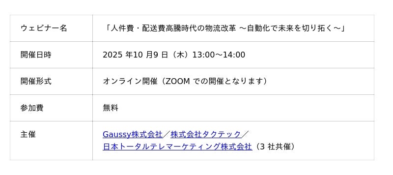 株式会社タクテック(東京都文京区、代表取締役社⾧:山崎 整、以下タクテック)は、2025年10月9 日(木)にGaussy 株式会社(東京都港区、代表取締役社⾧:櫻井 進悟、以下Gaussy)と日本トータルテレマーケティング株式会社(本社:東京都渋谷区、代表取締役社⾧:境 千春、以下 NTM)との共催で、ウェビナー「人件費・配送費高騰時代の物流改革 ~自動化で未来を切り拓く~」を開催いたします。