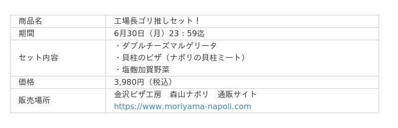 株式会社リエイ 石川県金沢市にて冷凍ピザの製造・販売を行う金沢ピザ工房 森山ナポリ(以下、モリナポ)は、2025年6月13日(金)放送のTBS系列『知識の扉よ開け!ドア×ドア クエスト』の食のプロたちが本気で選んだ「ご当地冷凍食品TOP10」にランクインいたしました。只今、放送で紹介をされた「塩麹加賀野菜」など、大人気ピザを含む「工場長ゴリ推しセット!」を大好評販売中です。