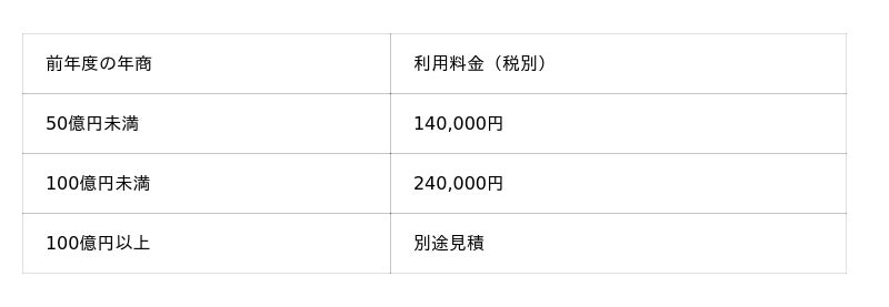 休眠対策ダブルの利用料金は次の通りです。分析データ量(前年の年商)に応じた設定となっています。