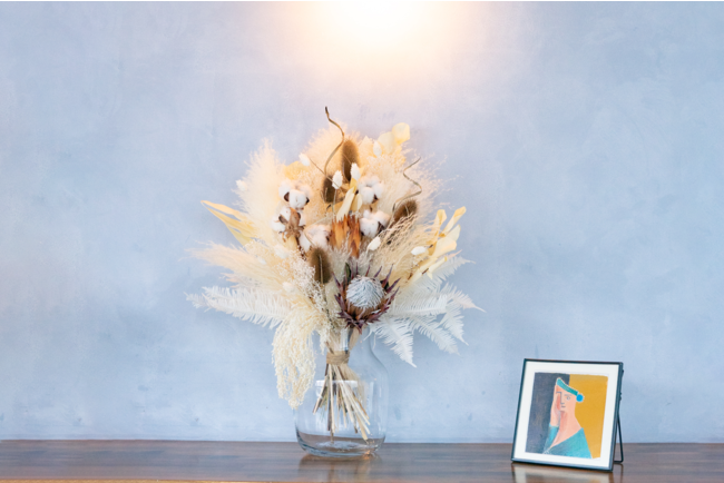 大きいサイズの花瓶アレンジは、ひとつ置くだけで存在感がありその場を華やかに飾ります。一般的に法人の贈答品として胡蝶蘭、記念日のお祝いとして生花を選ぶ方が多い中、AND PLANTSでは「部屋に、眺めを。」のコンセプトの元、生花と比べて飾りやすく、時間を経て色合いも変化し長くお楽しみいただけるドライフラワーを新たな選択肢としてご提案します。