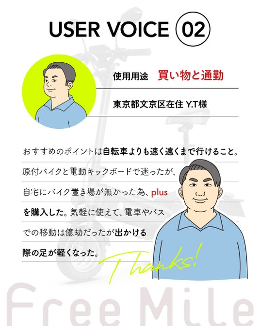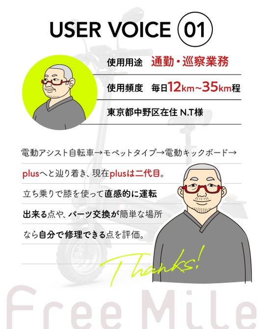 ご購入はこちら・ご購入者さまの声 Free Mile plusをご愛用いただいているユーザー様のお声をご紹介します。みなさまの日常に寄り添うアイテムになるように。ぜひご購入の参考にしてください。