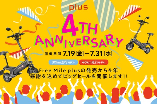 ジャパンクオリティのEVモビリティの開発・販売を行う FreeMile 株式会社(所在地:東京都渋谷区、代表取締役:三本 茜)は、『Free Mile plus発売4周年記念特別キャンペーン』を 2024年7月19日(金)12:00から公式ECサイトにて開始します。