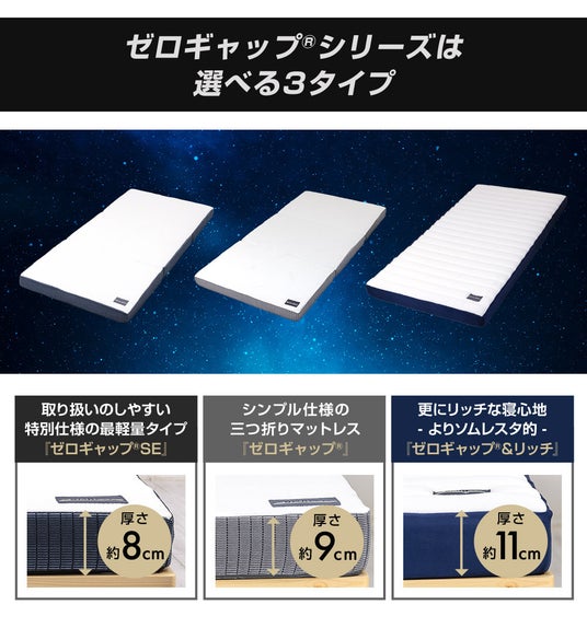 ■「ゼロギャップ 三つ折りマットレス シリーズ」の概要名称:ゼロギャップ 三つ折りマットレス シリーズ (ゼロギャップ、ゼロギャップ&リッチ、ゼロギャップSE)
