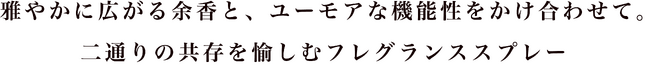 株式会社SHICA待望の新アイテムが全3種の香りで登場。ルームスプレーとしてだけではなく、ディフューザーとしても使用でき、更にインテリアとしても際立つユーモアな機能性を兼ね備えたフレグランススプレーを展開致します。