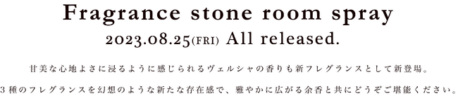 〈ルームスプレー〉〈ルームディフューザー〉二通りで使用できる機能性を兼ね備えたスペシャルセット、「フレグランスストーンルームスプレー」が3種のフレグランスで登場。