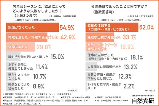 株式会社自然食研(所在地:大分県豊後高田市、代表者:佐々木 興平)は、1.週1回以上飲酒する20~60代の男女/2.内科医を対象に、「忘年会シーズンにおける飲酒失敗エピソード」に関する調査を行いました。