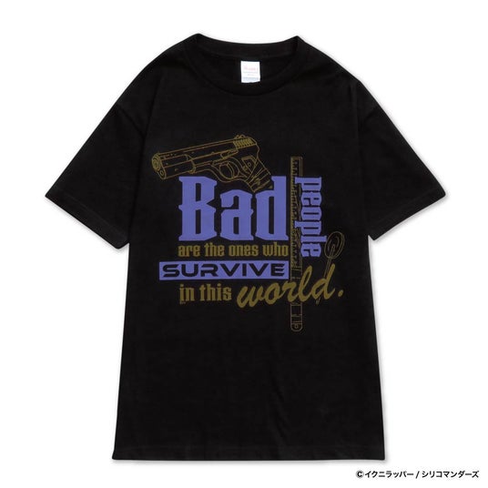 第4話の「久慈 誓」の名言である「この世界は悪い奴が生き残るんだ」を英訳し、「久慈 誓」を思わせる銃やキャンディ、定規とともにデザイン。