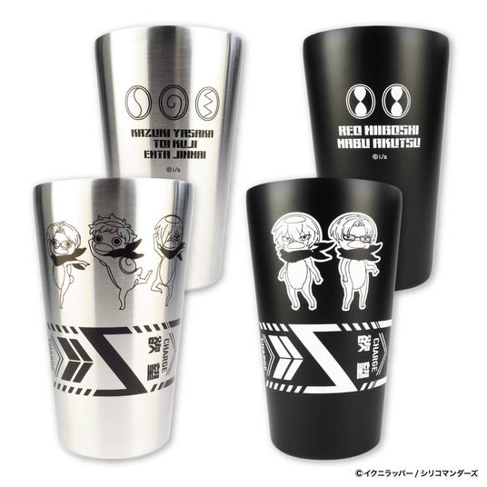 真空二層構造で保冷保温機能付きのステンレスタンブラー。メタリックシルバーのボディに「矢逆一稀・久慈悠・陣内燕太」、マットブラックのボディに「新星玲央・阿久津真武」のカッパ姿のイラストと欲望リングをデザイン。バックには各キャラクターの名前と甲羅をプリント。