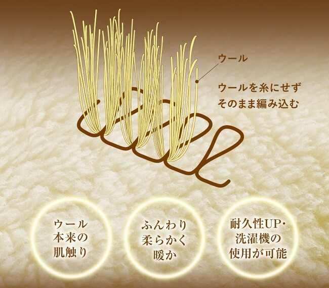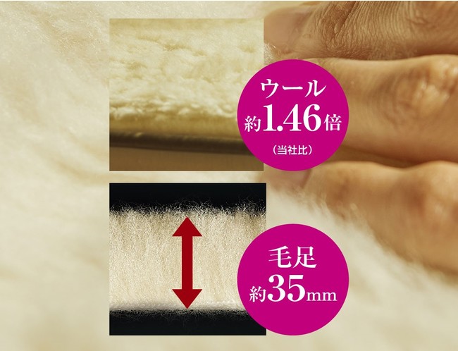 さらに暖かくなった「MAXIMUM The Sofwool(R)️」「MAXIMUM The Sofwool(R)️(以下マキシマム・ザ・ソフゥール)」の毛足は約35mm、指先が埋もれるほどのふっくら感で体を暖かく包み込みます。同シリーズの「The PREMIUM Sofwool(R)️(ザ・プレミアム・ソフゥール(R)️)」と比較して毛密度が146%にアップ、さらに高密度になることで暖かさが増しました。ウールを贅沢に使用しています。