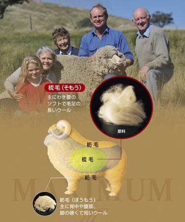 ウールの素材も厳選マキシマム・ザ・ソフゥールは上質なオーストラリア産のラムズウールを厳選して使用しています。ラムズウールは生後6か月~10か月の仔羊のファーストカットで採れたウールのことで、採取量はウール全体の約0.32%以下と大変希少なウールです。また一般的なウール毛布は日焼けして硬くなった背中や汚れの目立つ下肢部分の紡毛(ぼうもう)を使うことが多いのですが、マキシマム・ザ・ソフゥールは抜群に柔らかい脇腹部分の梳毛(そもう)のみを使用しています。ウールマークの基準もクリアしており安心です。