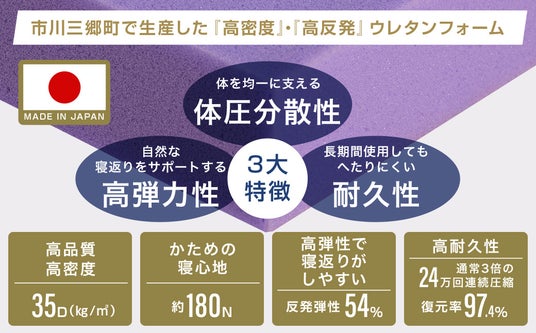 硬め約180N(ニュートン)の寝心地で、寝返りのしやすい高弾性(反発弾性54%)、耐久性を示す繰返し圧縮残留ひずみ試験(JIS K 6400-4 B法)では通常8万回の3倍の24万回連続圧縮の結果、復元率97.4%と高い耐久性を実現しました。