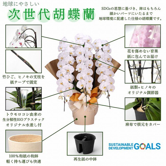 彩株式会社鉢はもちろん、細かいパーツにいたるまで徹底的に環境に配慮した仕様の胡蝶蘭