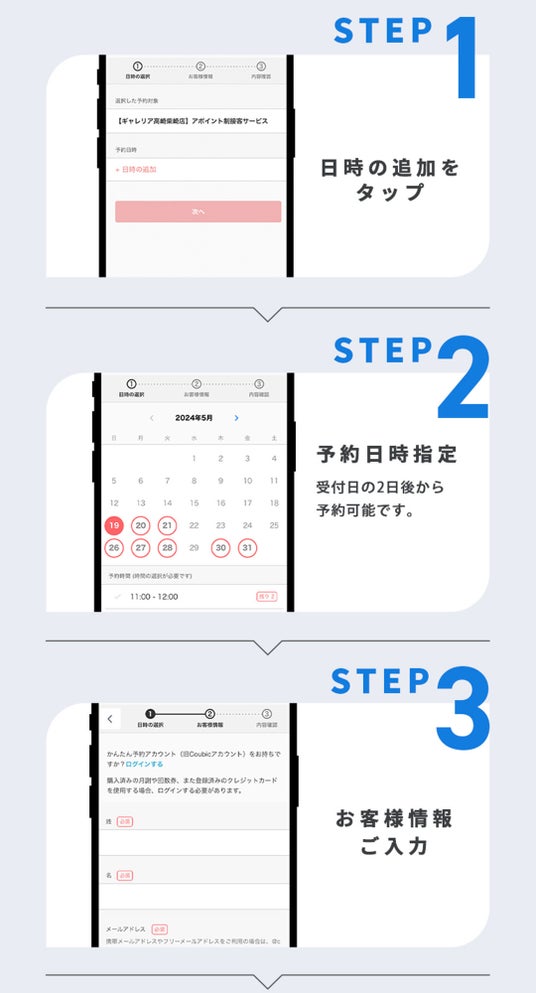 https://www.galleria-mall.jp/list/brand_item/page_list_brand.html▼お待たせしない、新たな接客サービスも導入ギャレリア柴崎店では従来のご来店・お買い上げのご購入フローに加え、事前にお電話や当店予約サイトより来店ご希望日時をご予約いただける
