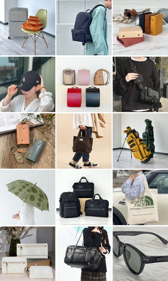 バッグ以外では eyevol・IZIPIZI などの「アイウェア」や 、Wpc. を中心に「傘」も充実のラインナップ。BRUNO・Aladdin といったデザインが特徴的な家電ブランドも取り扱っており、そのほか、帽子・マフラー・ソックスなどの服飾雑貨に至るまでシームレスで幅広いジャンル展開を行っている。