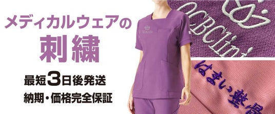 「メディカルウェア」の取り扱いを新たに開始します。オリジナルの刺繍加工を施しても業界最速の「最短3日後発送」でお届けできるので、お急ぎの場合もお任せください。また、初めて刺繍のオリジナルグッズを作製する方にも安心してご利用いただけるように、様々なサービスをご用意しておりますので、この機会に是非ご利用ください。