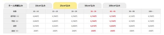 ダブを切り替える事で、ご希望のデザインサイズの価格を一目で確認できる価格表。