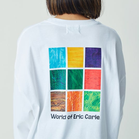 エリック・カールのコラージュアートの色鮮やかな色彩がビックシルエットのホワイトボディに映えるTシャツです。このコラージュアートは「はらぺこあおむし」で使用しているカラーをベースにセレクトしています。半袖と長袖があるので、シーズン問わずに楽しめます。