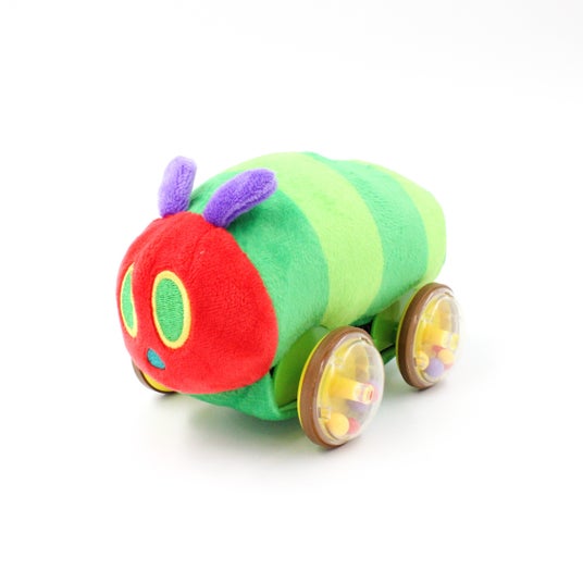 あおむしを後ろに引いて手を離すとピューっと走る、はらぺこあおむしのおもちゃです。タイヤの中のカラフルな玉が転がると、カラコロ音がします。