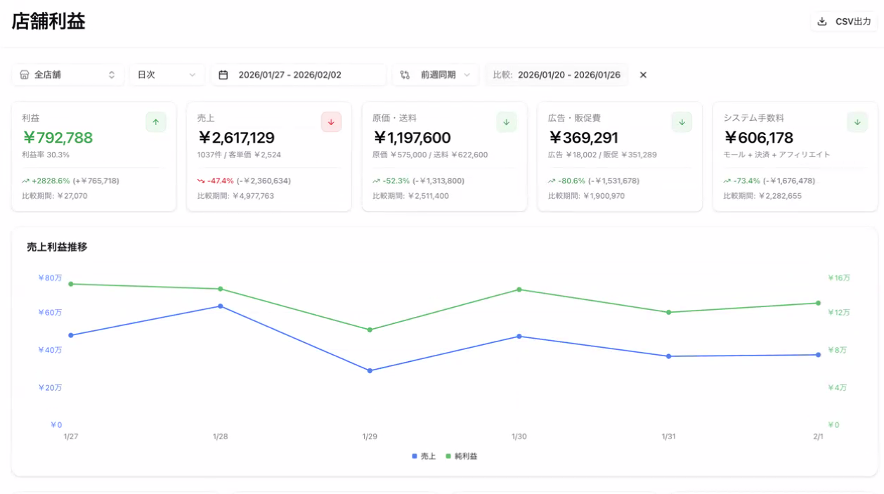売上だけでなく、原価・送料・ポイント・クーポン・広告費・モール手数料など、利益に直結する数値を自動で集計・可視化します。