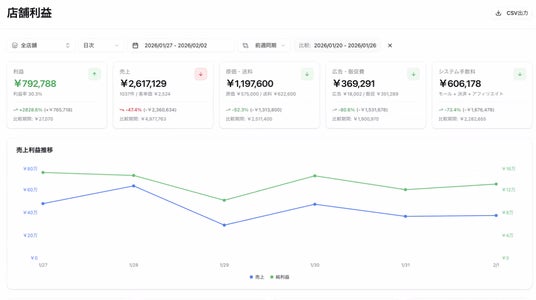 売上・費用・利益を自動集計し、日次単位で利益を可視化。