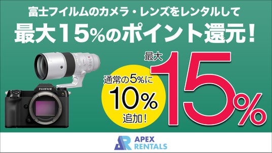 デジタルカメラ、交換レンズなどのレンタルサービス「APEX RENTALS」を手がける株式会社ビデオエイペックス(本社:東京都中央区日本橋蛎殻町1-7-9オンラインビル1F 代表取締役:片山洋平、以下:弊社)は2025年5月1日より『富士フイルム製カメラ・レンズ 15%ポイント還元キャンペーン』を開始します。本キャンペーンでは、対象の期間にご希望の富士フイルム製のカメラボディ・レンズをレンタルしていただくと、通常5%のAポイントに加え、追加10%を上乗せして付与します。