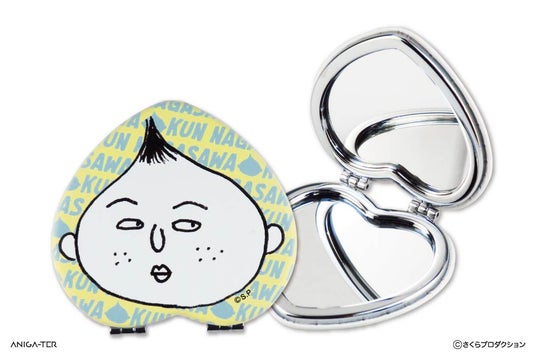 玉ねぎ頭から着想を得た、ハート型を逆さにして「永沢くん」のイラストをプリントしたコンパクトミラー。通常鏡と拡大鏡の両面鏡タイプ。