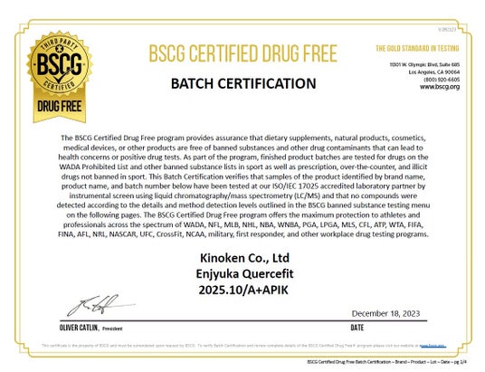 機能性表示食品検定協会(以下、キンケン 所在地:東京都渋谷区、会長:持田 騎一郎)が販売している花粉アレルギー対策の機能性表示食品「延寿花(えんじゅか) ケルセフィット」の新しい製造ロットが、2023年12月18日にBSCGアンチドーピング認証「ドラッグフリー」の再検査に合格し、認証の更新に成功しました。機能性表示食品「延寿花 ケルセフィット」は、2023年3月に日本の機能性表示食品として世界で初めて(*1)のBSCGアンチドーピング認証を取得していましたが、その認証の更新となります。