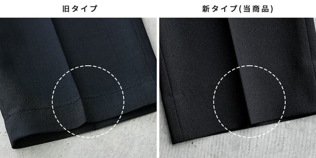 裾の部位はステッチ糸を表に出しておらず、バックポケットのボタンを無くすことで、ゆったりしたテーパードパンツながら、ドレッシーな印象の仕上げとなっております。