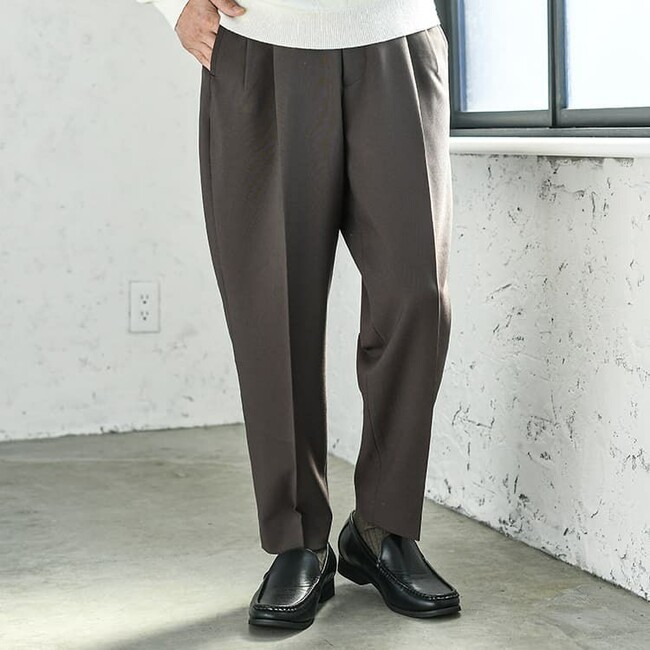大人のワイドテーパードパンツ「大人のテーパードパンツ」よりもウエストまわりがゆったりとした設計になっており、体型が気になり始める30代~40代の方にもストレスなく穿けるウエストゴムを採用しました。コーディネートに上品な印象を与える2タックデザインで、下半身にゆとりをつくり窮屈感のない穿き心地となっています。