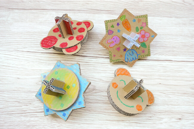 家族で楽しめるダンボール製コマの工作キットを開発しました。