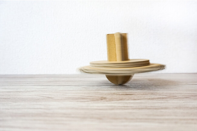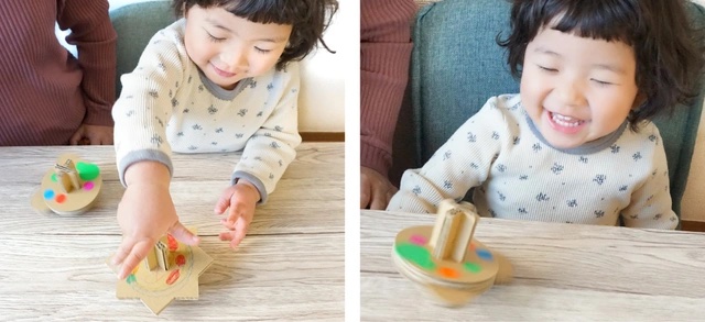 この度、改良を重ねた「クマ」「ギザギザ」の2種のデザインのコマを、Makuakeのみで先行販売させて頂きます。ダンボール製ですがよく回り、はじめてこまに触れる小さなお子様にも楽しんで遊んでいただけます。
