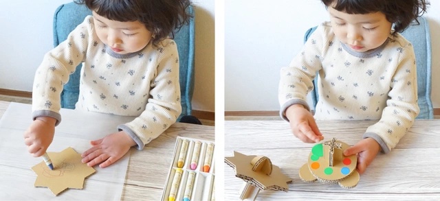 シンプルな生成りのダンボールの上に、色を塗ったりシールを貼ったり飾り付けをして楽しめます。