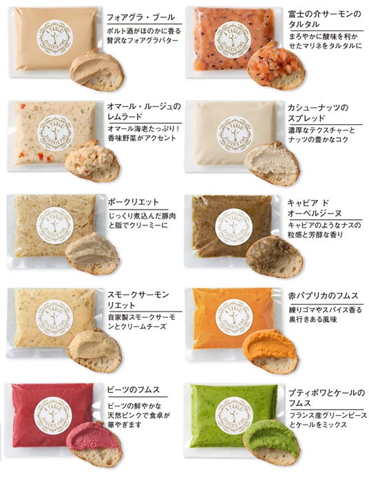 高級食材をふんだんに使用した新商品「オマール・ルージュのレムラード」「フォアグラ・ブール」「富士の介サーモンのタルタル」「カシューナッツのスプレッド」の4種セットと、新商品を加えたフルラインアップの全10種セットをMakuake限定でご用意。本格フレンチならではの多彩で贅沢な味わいをご堪能いただけます。