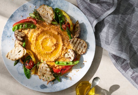 フムスにグリルしたパンや野菜を添えて。主役級の存在感と満足感