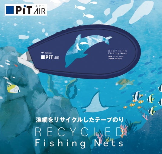 【発売記念】期間限定今だけの特別価格でご提供!!お名入れ無料キャンペーン!使い終わった漁網をリサイクル!! 役目を終えた漁網を再生事業者が回収・分別・洗浄・ペレット化し、再生ナイロンとなったものを、トンボがあの人気シリーズテープのり「ピットエアー」本体の上部ケースに使用しました。