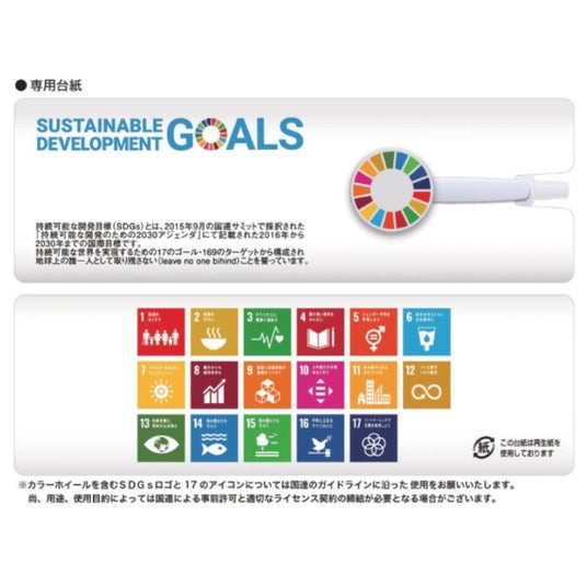 SDGsロゴマーク付きクリップ、台紙へ17のアイコンが印刷されてるだけでなく、日本国内で回収した海洋プラスチックごみからリサイクルした再生樹脂を使用した環境配慮商品となっています。