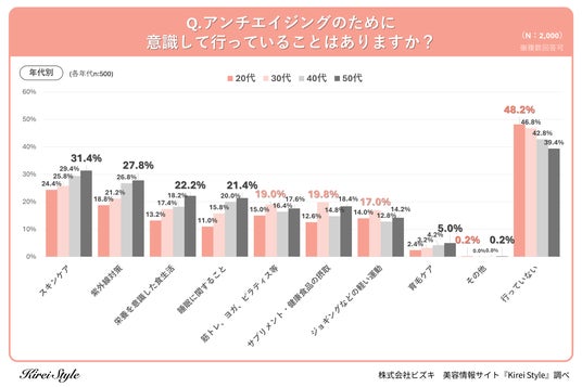 「今のキレイも、10年後の輝きも」をコンセプトに美容や健康にまつわる情報を発信する「Kirei Style(キレイスタイル)」の運用を行う株式会社ビズキは、全国の女性2,000人を対象に美容に関するアンケートを実施し、年代別等の特徴についてまとめました。本プレスリリースの転載ではなく、記事内容/グラフ/データなどを引用される際は、必ず下記リンクを出典元としてご記載いただくよう何卒ご協力お願い申し上げます。