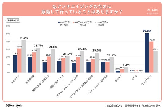 年代別で見ると、年代が上がるに連れてアンチエイジングに取り組む方も多くなる傾向にあり、特に「スキンケア」や「紫外線対策」のような外からのアプローチを実施している方が増えるという結果になりました。
