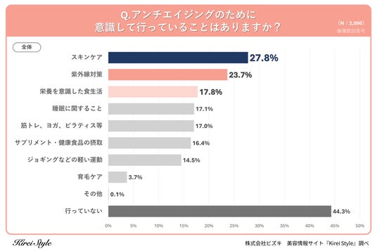 全国の20代~50代の女性を対象に、「アンチエイジングのために意識して行っていることはありますか?」というアンケートを実施したところ、最も多かった回答は「スキンケア」で27.8%となりました。次いで、「紫外線対策」が23.7%、「栄養を意識した食生活」が17.8%と続く結果になりました。