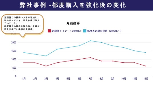 実際に、弊社の事例でも都度購入の販促を強化し始めた事で売上と利益が大きく伸びた実績も出ております。
