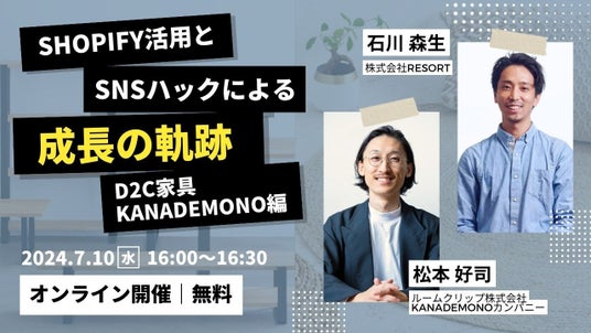 株式会社RESORT (本社所在地:東京都渋谷区 代表取締役 河野 裕太)のCo-Founder & Chairman:石川森生が2024年7月10日(水)に「ECカンファレンス2024 Summer」の「Shopify活用とSNSハックによる成長の軌跡 ~D2C家具KANADEMONO編~」に登壇することをお知らせいたします。
