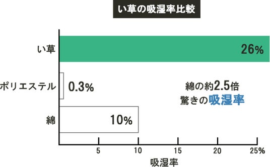 ■朝までサラリとさわやか い草の機能【汗ばんでも安心!い草の優れた吸湿力と消臭力】い草には綿の約2.5倍の吸湿力があり、寝汗をかいてもしっかりと吸収してくれ、いつでもサラサラの肌ざわり。それに加え、い草はアンモニアや酢酸など生活臭の原因物質を吸着し減少させることができるから、ニオイも気になりません。また、い草はその表皮に油分をもっているため非常に汚れにくい性質があります。お洗濯のわずらわしさから解放されます。お手入れも日陰干しをするだけで簡単です。
