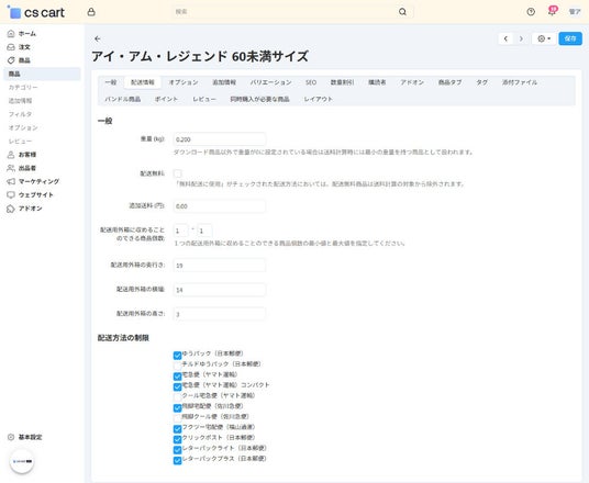 管理画面の「商品 > 商品編集 > 配送情報」タブにある配送情報設定では、商品の重量、配送用外箱の奥行き、配送用外箱の横幅、配送用外箱の高さに加え、「配送方法の制限」で当該商品の利用可能な配送方法を指定できます。