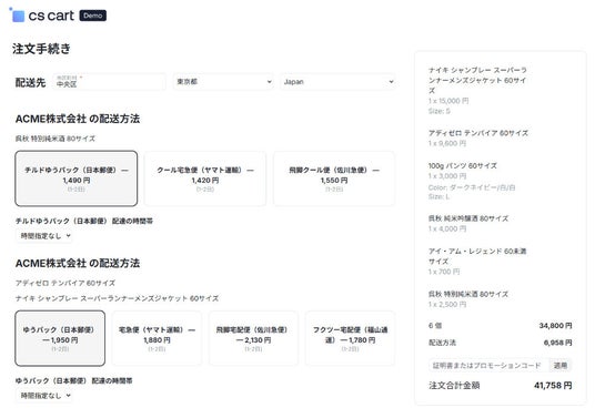 注文手続き画面では、カート内商品の条件に基づき利用可能な配送方法が自動でフィルタされてグルーピングが行われます。