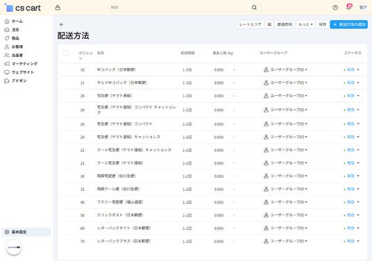 管理画面の「基本設定 > 配送方法」では、マーケットプレイス全体で利用する配送方法を指定できます。