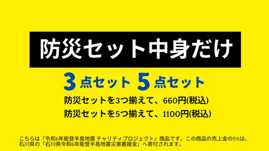 令和6年能登半島地震チャリティ商品である『防災セット中身だけ』の売上金の5%、『マスク』の売上金の10%を『 石川県令和6年能登半島地震災害義援金』へ寄付いたします。